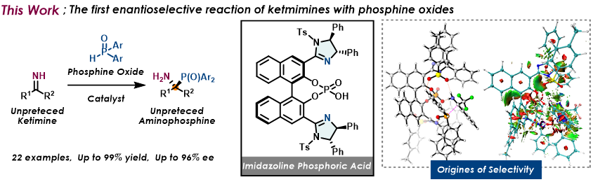 我々が独自に開発されたイミダゾリンリン酸触媒を用いることで、無保護ケチミンへのホスフィンオキシドによる不正ヒドロホスホニル化反応が高立体選択的に進行することを見出しました。また、反応機構解析により、触媒と反応基質間の相互作用や触媒構造の歪みが与える影響を調査し、立体選択性の発現要因を明らかにしました。