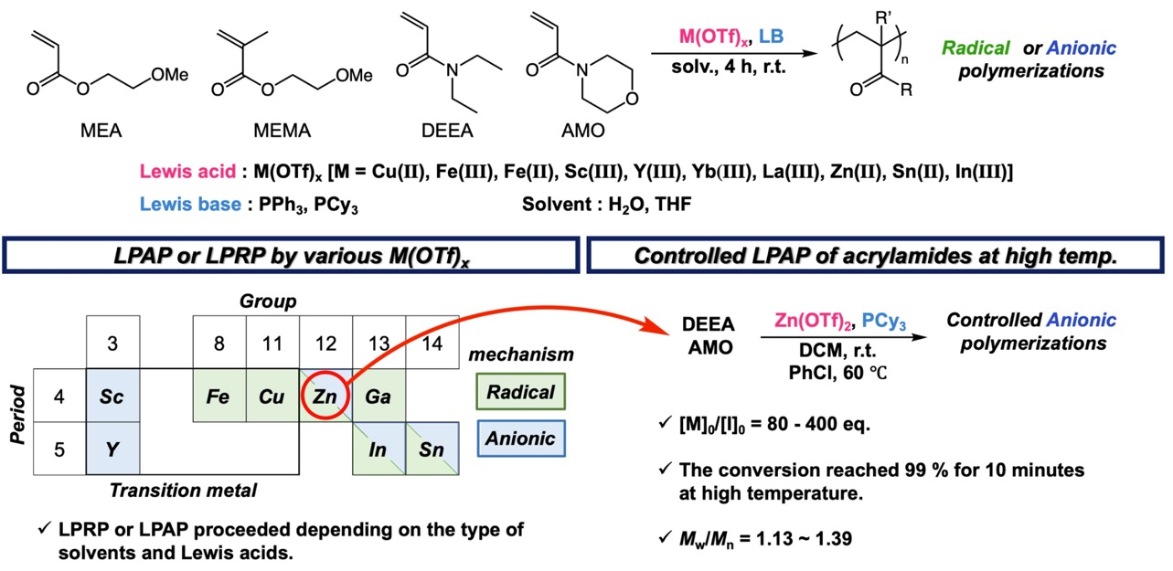 本研究室では、極性ビニルモノマーの重合における新規重合法の開発と反応機構の解明に取り組んでいます。今回、金属トリフラート類とPPh3を組み合わせたルイスペア触媒が、ラジカル重合とアニオン重合を進行させることを見出しました。金属触媒の影響や反応速度論などに基づき、反応機構を明らかにしました。また、高温条件下での制御アニオン重合性について報告しました。
