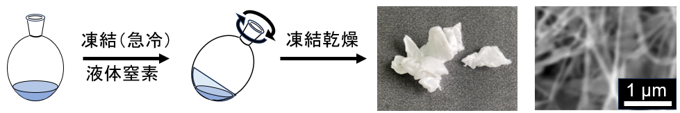 コンニャク芋の主成分であるコンニャクグルコマンナン(KGM)を原料としたナノファイバーを作製出来るのではないかと考えました。KGM水溶液を液体窒素で急速に凍結させ、凍結乾燥を行うことにより、繊維径の平均が100 nmのサンプルの作製に成功しました。実験操作がとてもシンプルで、特殊な機械や高額な化学物質を用いません。したがって、低コストかつ環境負荷を抑えて作製できることが本研究の強みであると言えます。
