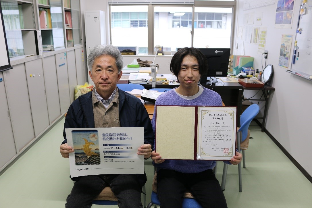 この度は第61回日本生物物理学会年会より学生発表賞を賜りましたこと、大変光栄に存じます。ご指導・ご鞭撻を賜った先生方をはじめ、研究室のメンバー、関係者の方々に深く感謝を申しあげます。今後は、V2HeR3のさらなる分子メカニズムの解明だけでなく、ウイルスと光の関係から「ウイルスは生命なのか」という根源的な問いにも挑戦し、日本の研究の発展に貢献できるよう、よりいっそう研究活動に励む所存です。