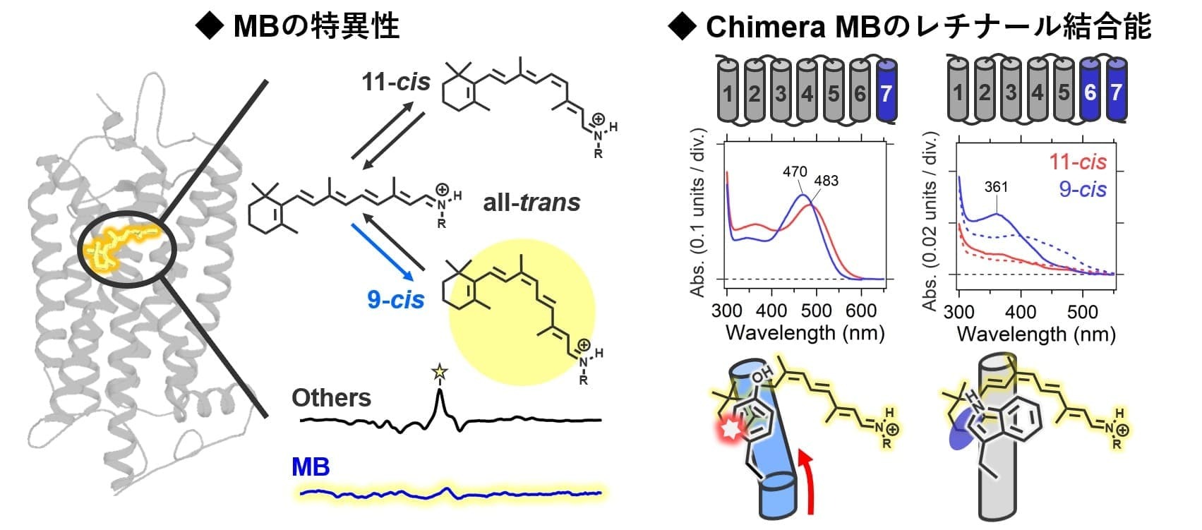 霊長類は色覚視物質という光受容タンパク質により色を認識しており、その中でも青視物質(MB)は特異な分子進化の結果、現在の青色光吸収を獲得しました。本研究では、MBが唯一、発色団異性体の9シスレチナールを結合しないという特異性の構造基盤解明に迫りました。MBを構成するヘリックスを一本ずつ置換したキメラMBのレチナール結合能を測定した結果、第6ヘリックスが結合能に重要であることが分かりました。本研究の進展により、MBの分子進化を構造レベルで理解できることが期待されます。