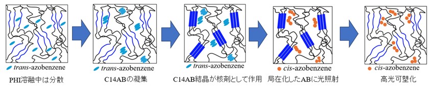 UV光照射によるアゾベンゼン(AB)の光異性化を利用したAB添加結晶性ポリエステルの光可塑化の研究を行っている。高い光可塑化性を発現させるため、テトラデカンを付加したAB(C14AB)を用いたところ、ポリエステル中でC14ABが凝集体を形成することによる不均一化に伴う高い光可塑化性が発現した。また、C14ABの凝集体が結晶核剤としても作用していることが分かり、UV光照射前後で結晶核剤→光可塑剤として作用する特異な現象を発見することができた。