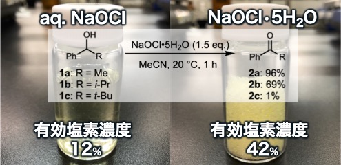 次亜塩素酸ナトリウム水溶液を酸化剤とし、有機ラジカル種を触媒とするアルコールの酸化反応は、第1級アルコールのみを選択的に酸化できる方法です。ところが結晶化した高純度の次亜塩素酸ナトリウム五水和物を用いると、無触媒で第2級アルコールが酸化できることを私たちは報告しています。今回、性質の異なるアルコールの酸化反応を検討したところ、有機ラジカル種を触媒とした場合とは大きく異なり、立体的効果の影響は大きく受ける一方、電子的な影響は小さいことを明らかにしました。