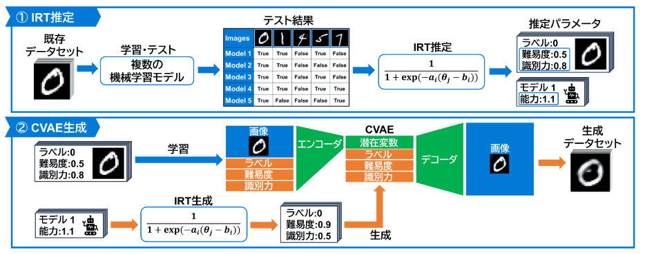 機械学習の教育用競技会では、参加者の能力を適切に評価可能なデータセットの選択が課題となっています。本研究では、試験問題作成に用いられる項目反応理論 (IRT) と、パラメータに応じた画像を生成する条件付き変分オートエンコーダ (CVAE) を組み合わせ、評価能力の高いデータセットを自動生成するフレームワークを提案しました。機械学習モデルでの評価実験と競技会形式の被験者実験により、生成したデータセットがモデルの性能差をより明確に示すことを確認し、競技会運営への応用可能性を示しました。