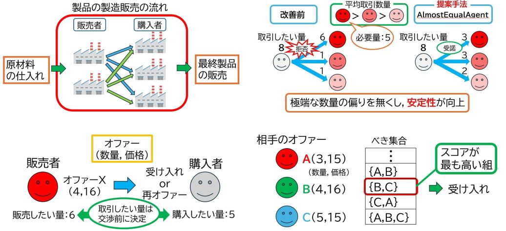 自動交渉エージェントの国際競技会であるANAC2025-SCML-OneShotトラックにおいて1位を受賞しました。参加者は、製品の購入販売の交渉を行う自動交渉エージェントを作成します。そして、それぞれのエージェントが交渉による利益を競います。エージェントの基本動作は主に2つで、相手に提案を行う動作(オファー)と、相手からの提案を受け入れるか決定する動作(受け入れ)があります。私たちは、過去の取引数量が多い相手順に少しだけ多く製品を分配するというオファーと、相手からのすべてのオファーをもとにべき集合を生成し、最適なオファーの組み合わせを評価するという受け入れを実装したAlmostEqualAgentを作成しました。
