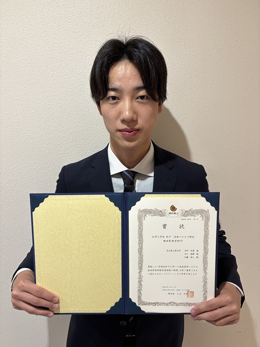 この度はこのような栄えある賞を受賞することができ、大変光栄に存じます。指導教員の古川陽輝先生には大変感謝するとともに一緒に研究してきた研究室の先輩、同輩、後輩のおかげと存じます。これから社会人として旅立ちますがこれを誇りに社会に貢献したいと存じます。ありがとうございました。