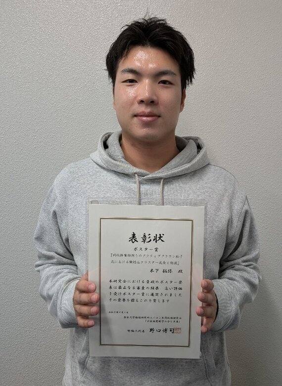 この度は栄誉ある賞をいただき、大変光栄に思っております。本研究を形にするにあたり、粘り強くご指導くださった礒部先生、そして日々多くの議論を交わしてくれた研究室の仲間に心から感謝いたします。自分一人の力では辿り着けなかった結果であり、周囲の支えを改めて実感しています。この受賞を大きな励みとして、これからもより一層研究に精進してまいります。