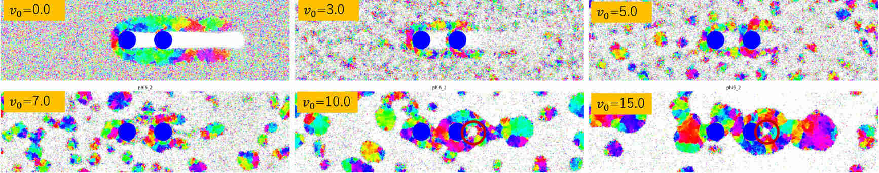 多数のアクティブブラウン粒子(自ら推進力を持ちランダムに方向を変えながら動く粒子モデル)の流れが2つの円柱障害物を通過する際の非平衡な結晶形成を大規模シミュレーションで解析した。自己駆動の速さの増大に伴い障害物間での粒子衝突が誘起され、結晶化が急激に進行することを発見した。この結晶領域が流動を遮る壁として機能し、障害物下流側に定常的なボイドを形成する。自己駆動と幾何学的制約の相互作用が生む秩序形成の全体像を相図として明らかにした。