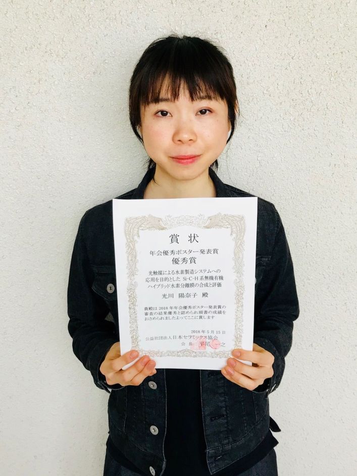 生命・応用化学専攻の光川陽奈子さんが2018年年会日本セラミックス協会年会優秀ポスター発表賞で優秀賞を受賞しました。
