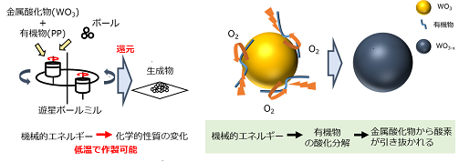 本研究では、メカノケミカル還元法と呼ばれる表面改質手法を用いて高活性な可視光応答性光触媒を合成することを目的としています。有機高分子と金属酸化物に機械的エネルギーを与えることにより酸化物表面の化学構造を制御しています。一般的に、酸化タングステンは可視光領域での光吸収能がある一方で光触媒反応効率の低さが課題として挙げられますが、表面の化学構造を制御することにより触媒性能の向上に成功しました。
