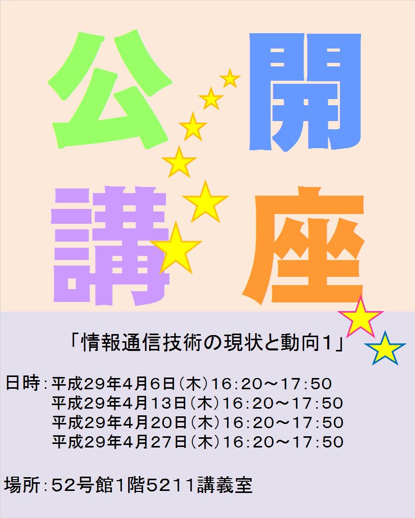公開講座「情報通信技術の現状と動向1」の案内です。52号館1階5211講義室で16時20分から開催します。