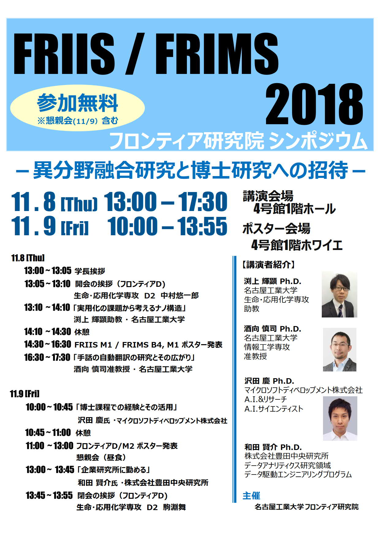 今回は、本学卒業生であるマイクロソフトディベロップメント株式会社 A.I.&リサーチ 沢田 慶氏による招待講演「博士課程での経験とその活用」、株式会社豊田中央研究所 データアナリティクス研究領域 和田 賢介氏による招待講演「企業研究所に勤める」、また、FRIIS、FRIMSのメンバー研究院2名による先端研究に関する講演です。