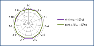 2-1〜2-11の創造工学の中間値と全学年の中間値 |