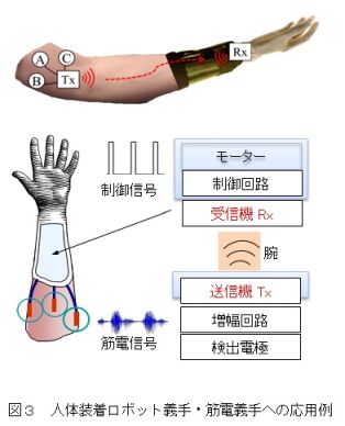 (4) 体内深部から体外への通信だけでなく、体表での通信にも応用できます。例えば、体表複数箇所で筋電信号を取得し、それらを人体に装着されるロボット義手に高速で送り、多数の義手駆動モーターを低遅延で同時に制御することができます。これにより、人体装着型義手ロボットをヒトのように巧みに動かし、実際のヒトよりさらに力の要る仕事(産業ロボット)やヒトの手や指でできる仕事よりさらに精巧な仕事(精密ロボット)をすることができます。また、事故で腕や足を失った方の義肢や、病気で脳の指令が四肢に伝わらない患者の四肢のワイヤレス制御にも応用できます。(図3)