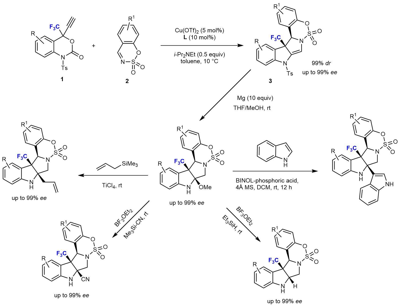 今回、柴田教授らは、アレンとトリフルオロメチル基を持つエチニルベンゾオキサジナノン類1と、環状スルファミルイミン化合物2とを不斉配位子Lの存在下、銅(Cu)触媒を用いて反応させると、脱炭酸反応を伴いながら、カスケード型縮環反応を起こして、特異な化学空間を持ち、トリフルオロメチル基が不斉四置換炭素上に結合した多環式インドール/インドリン化合物3が高い立体およびエナンチオ選択性で合成出来ることを見出しました(図2)。この反応手法は、天然から得られるアルカロイドの様な多環式物質で、かつ、天然には存在しないトリフルオロメチル基を持った有機化合物が、一挙に不斉合成出来る革新的なものです。新しい医薬品や農薬の開発研究をサポートする手法として大いに期待されます。