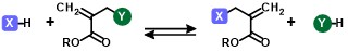 ここでは、アリル位に脱離基を有するメタクリル酸エステルと、求核剤の間で生じる反応を指す。溶液中、適切な触媒の存在下において、室温でも数分以内に完結する迅速性をもつ。また、無溶媒でも(固体でも)進行するため、材料化学との相性がよい。