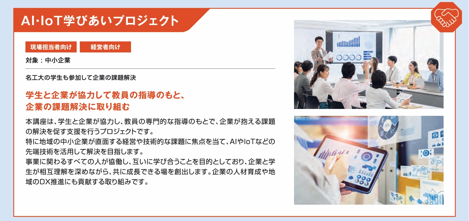 | ②AI・IoT学びあいプロジェクト | 教員の指導の下、学生と企業が協力して企業の課題解決に取り組む | 詳細 |